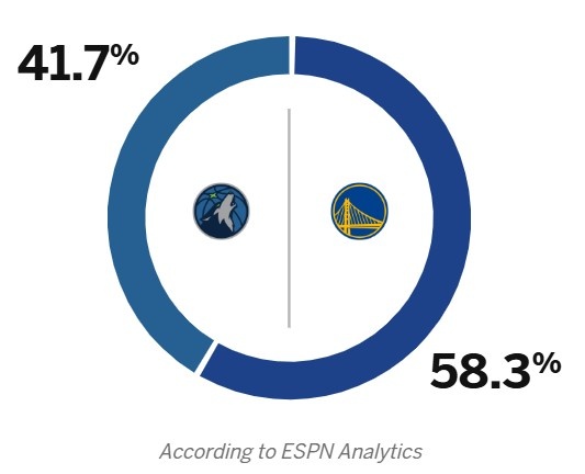 今天,ESPN預(yù)測本場比賽勝率,勇士58.3%,森林狼41.7%。