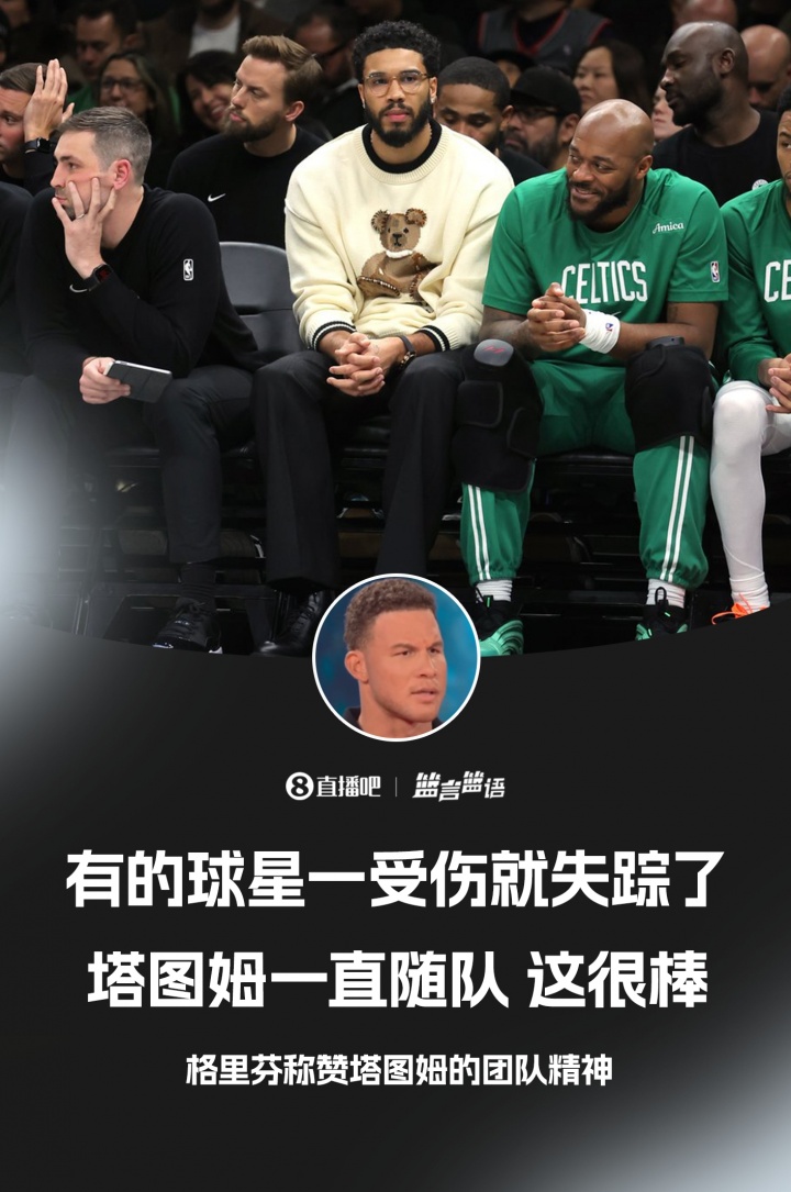 格里芬稱贊塔圖姆說:“有一些球星,受傷了之后就找不到人了,而他一直跟著球隊、在隊友身旁提供幫助,這非常了不起?!?/p>