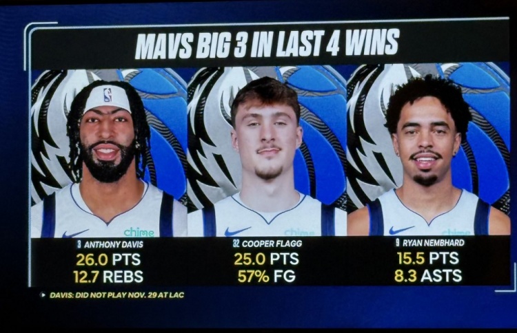 賽前,轉(zhuǎn)播方給出獨(dú)行俠過去4場(chǎng)勝利,濃眉、弗拉格、小納姆哈德三人組的數(shù)據(jù):