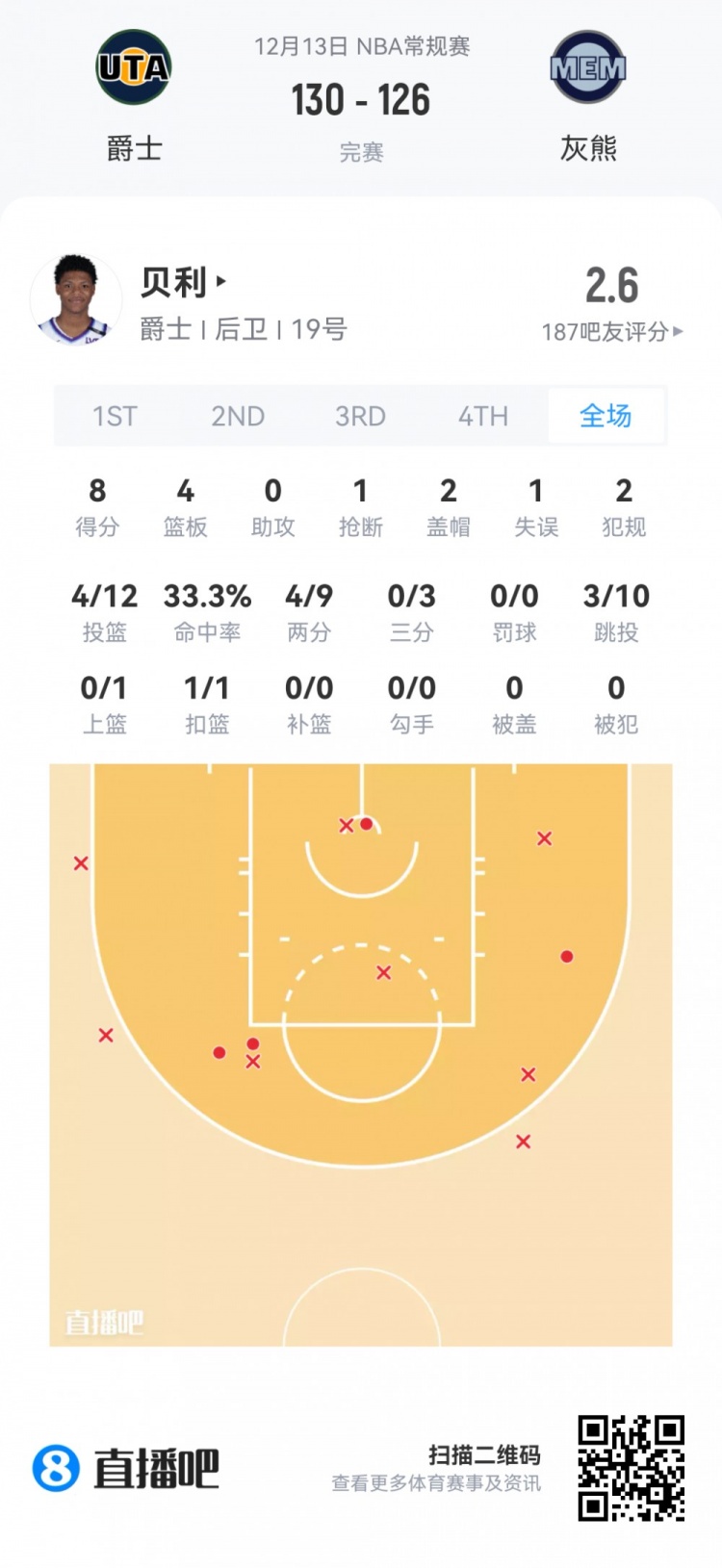爵士首輪5號秀埃斯·貝利 登場31.5分鐘