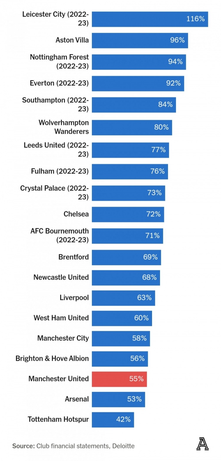 事實上,曼聯(lián)的工資收入比非常健康,是英超中工資占收入比例最低的俱樂部之一,多年來一直如此(如下圖)。問題在于,曼聯(lián)最好的球員、高薪的球員經(jīng)常上不了場。以盧克-肖為例,據(jù)匿名消息人士透露,這名球員在2023年4月同意續(xù)約4年,周薪約20萬鎊,還有額外獎金。與其他曼聯(lián)球員一樣,如果球隊無緣歐冠,待遇會降低,但據(jù)說減薪幅度低于球隊標準的25%。