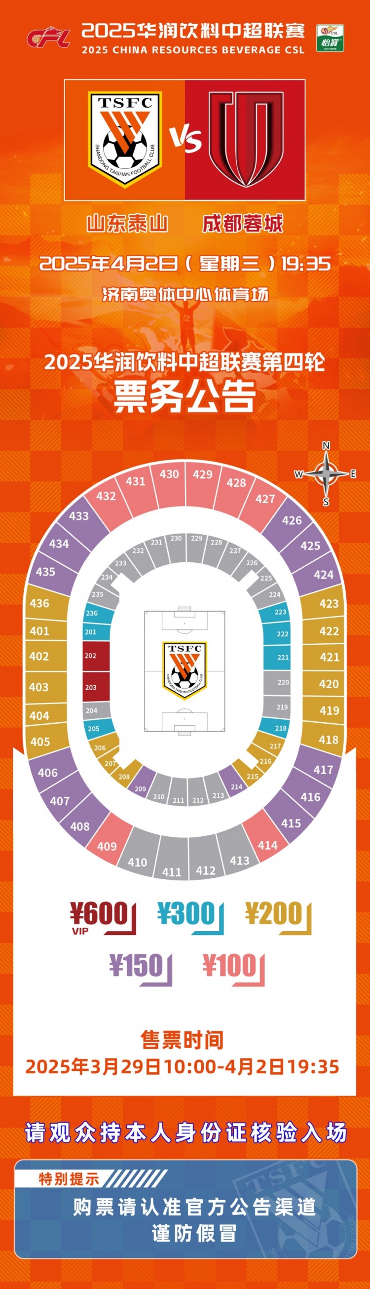 2025中超聯(lián)賽第四輪山東泰山隊主場賽事票務(wù)公告