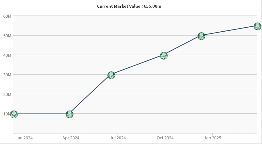 03月28日訊 德轉今日更新了巴甲的球員身價,即將在下賽季加盟切爾西的17歲小將埃斯特旺身價上漲500萬歐,來到5500萬歐。埃斯特旺現(xiàn)年17歲,司職右邊鋒。進入新賽季,他為帕爾梅拉斯出戰(zhàn)13場比賽打進5球。